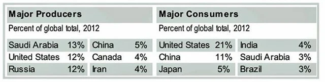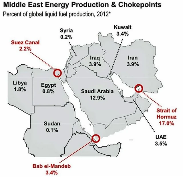 Kolik ropy se produkuje v jednotlivých zemích na Blízkém východě a kolik jí proteče strategickými místy ukazuje následující mapa.