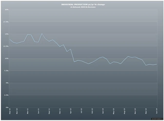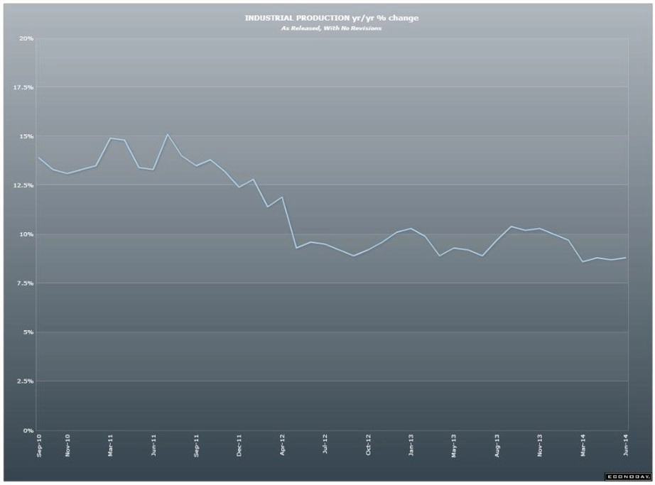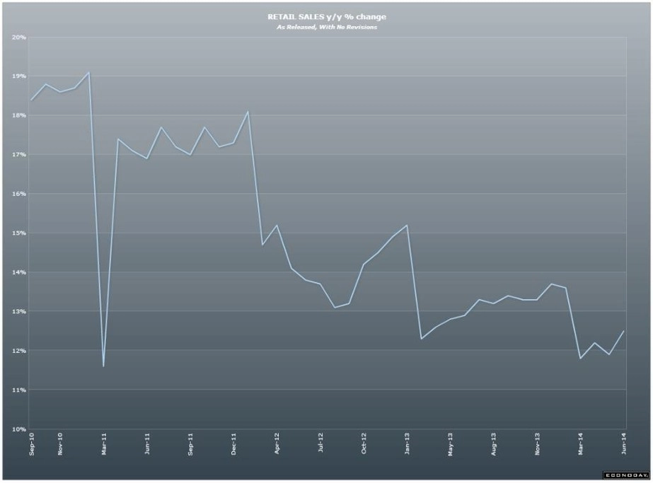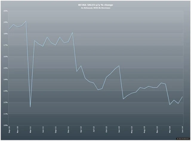 Maloobchodní tržby v květnu meziročně vzrostly o 12,5 % při očekávání mírně pomalejšího růstu o 12,1 %. V dubnu maloobchodní tržby meziročně vzrostly o 11,9 %. Vyšší tempo růstu tržeb podle analytiků posiluje naděje na to, že druhá největší světová ekonomika zastaví své zpomalování.