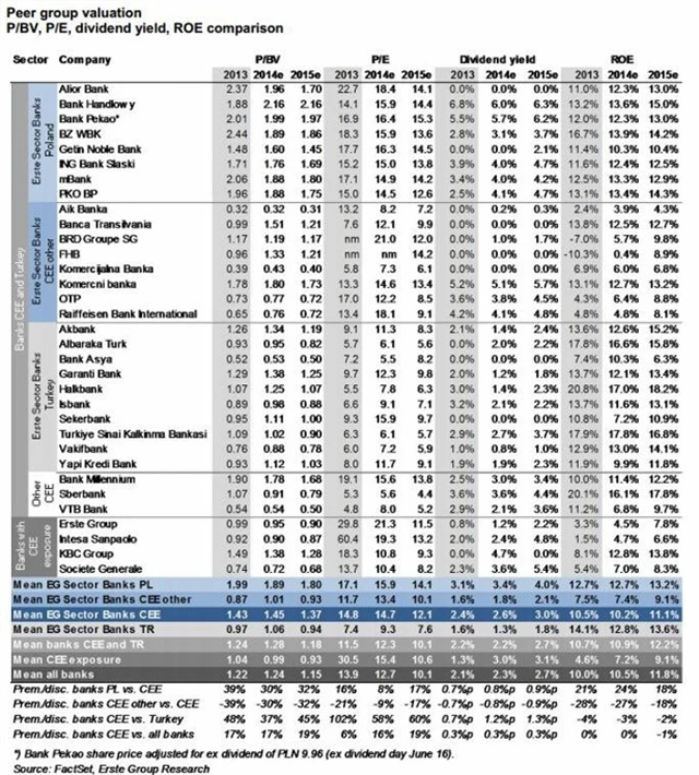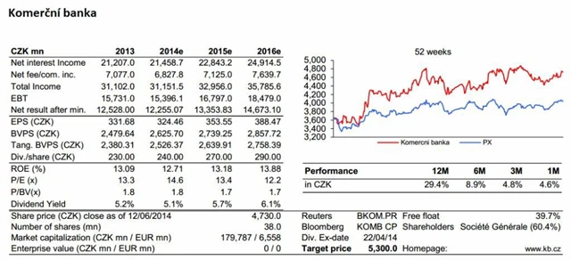 Komerční banka se v současnosti obchoduje na 1,8násobku odhadované účetní hodnoty (BV). To je 5 % pod polskými konkurenty, kteří se obchodují na 1,9násobku. Odhadovaná ROE pro rok 2014 je s polskými konkurenty shodná na 12,7 %.