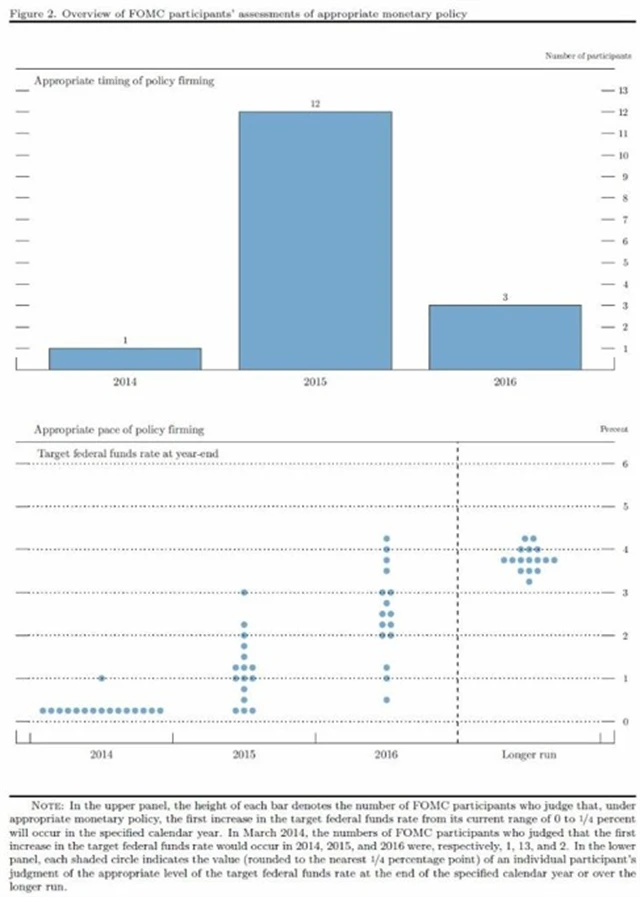 Aktuálně trh nejvíce řeší to, kdy Fed začne doopravdy zpřísňovat měnovou politiku, tedy zvyšovat sazby. Grafy ze středečního tiskového prohlášení banky ukazují, jak jsou rozvrstveny názory členů FOMC. Většina je pro zahájení normalizace měnové politiky v roce 2015, druhý graf pak ukazuje, na jaké úrovni by měla být základní sazba podle jednotlivých členů výboru na konci jednotlivých let.