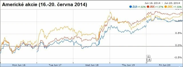 Americké akcie v týdnu stanovovaly stále nová historická maxima. Impulzem ke zrychlení růstu bylo především středeční zasedání Fedu a následná tisková konference šéfky centrální banky Janet Yellenové, která působila holubičím dojmem. Investoři po jejím projevu nabyli dojmu, že úroky v USA hned tak neporostou. Dow za týden přidal 1,02 %, S&P 500 dokonce 1,37 % a Nasdaq 1,33 %.