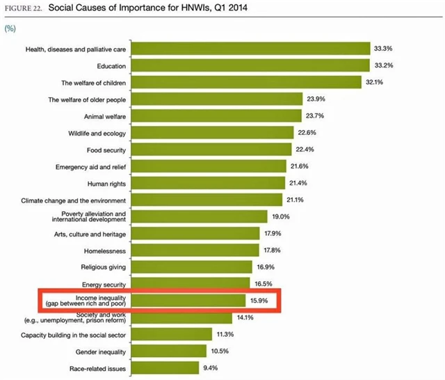 Prohlubující se propast mezi bohatými a chudými nejbohatší lidi na světě příliš nezajímá. Vyplývá to z průzkumu Capgemini a RBC Wealth Management. Přes 4 500 světových boháčů (lidí, kteří drží v investovatelných aktivech přes milion dolarů) odpovídalo na otázku "Kterým z následujících oblastí věnujete peníze, čas nebo svou odbornost?"