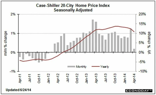 Ceny domů ve Spojených státech v dubnu podle indexu S&P/Case-Shiller, který sleduje ceny nemovitostí ve 20 amerických městech, meziročně vzrostly o 10,8 %, což je o 0,6 procentního bodu méně, než čekaly odhady. Meziměsíčně index podle sezónně neočištěných údajů vzrostl o 1,1 % (březen: +0,9 %, březen: +0,8 %). Sezónně očištěné ceny meziměsíčně vzrostly o 0,2 % (odhad: +0,8 %).