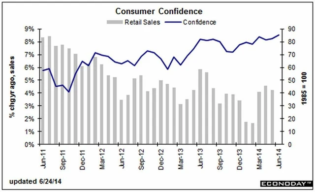 Průzkum ukázal, že roste počet Američanů, kteří příznivě hodnotí podnikatelské podmínky a vyhlídky na trhu práce. Ekonomové sledují údaje o spotřebitelské důvěře velmi pozorně, neboť se z nich snaží odvodit budoucí vývoj spotřebitelských výdajů. Ty v USA zajišťují více než dvě třetiny ekonomické aktivity.