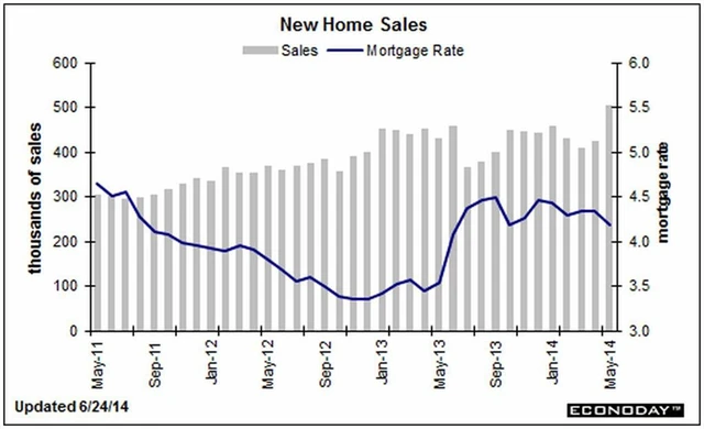 Prodeje nových domů ve Spojených státech amerických v červnu meziměsíčně vzrostly o 18,6 %, nejvíce za za posledních 22 let, na 504 tisíc jednotek. Podle agentury Bloomberg tento vývoj jednoznačně dokazuje, že negativní dopady tvrdé zimy, která se v USA podepsala i na realitním trhu, definitivně odezněly.