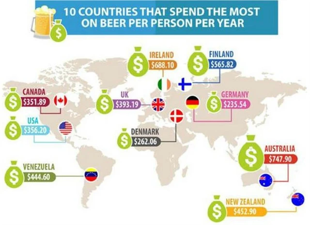 Na grafice serveru FinancesOnline.com, který sestavil žebříček deseti zemí, kde ročně lidé utrácejí nejvíce peněz za pivo na hlavu, bychom Českou republiku hledali marně. Nejvíce za pivo utrácejí v průměru Australané, v závěsu za nimi se drží Irové a Finové.