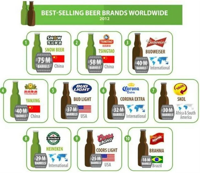 V žebříčku nejprodávanějších piv se mezi prvními deseti drží za rok 2012 tři čínské značky. Na třetí místo se však úspěšně vetřel Budweiser.