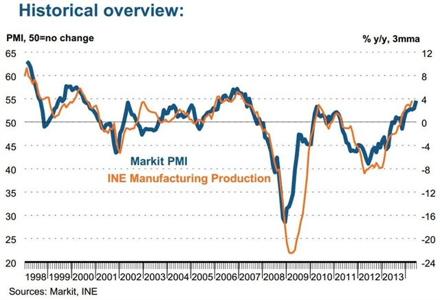 Produkce španělského zpracovatelského sektoru v červnu podle průzkumu agentury Markit vzrostla nejvíce od dubna 2010. Prudší nárůst zaznamenaly nové zakázky i zaměstnanost v sektoru a ceny výstupů rostou již druhý měsíc v řadě.