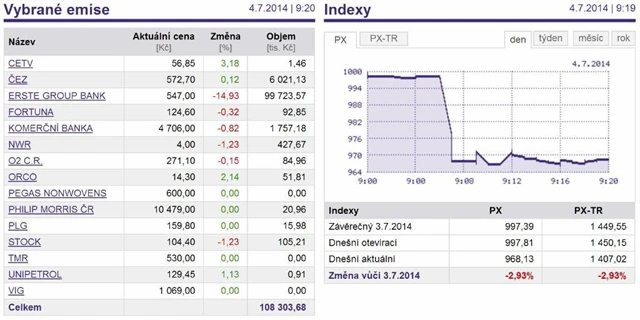 Pražská burza v úvodu padá téměř o 3 %, akcie Erste Group Bank po profit warningu odepisují skoro 15 %Index PX v 9.20 SELČ oslabuje o 2,97 % na 968,13 bodu. Redakce IW4. 7. 2014 | 9:15Akcie ČRErste Group Bank v letošním roce čeká kvůli Maďarsku a Rumunsku rekordní ztrátuZdroj: BCPPAktualita pro rok 2026Akcie ČRErste Group BankRedakce IW Další články autoraOčekávané výsledky světových firem v týdnu od 9. února: Coca-Cola, Ford Motor, Ferrari, SiemensTOP 10 článků týdne: 60 % bondů, volatilita bitcoinu a kovů, rentiérské portfolio a akciová rotaceAlphabet kvartálními výsledky překonal očekávání analytiků, tržby divize cloudu narostly skoro o polovinu DoporučujemeČeši mají superschopnosti, které se v chaosu 21. století budou hoditInovaceZáklady portfolia pro pasivní příjem: Jak uvažuje rentiér aneb Komu by se to nelíbiloInvestiční strategieVzkaz od profesionálů: Otočte portfolio 60/40, akcie v delším horizontu ztratí dechInvestiční strategie Aktualitydnes | 16:29Dohoda USA o venezuelské ropě otevírá otázku, koho Washington uznává jako vládudnes | 16:16Startup Apptronik získal 520 milionů dolarů, podporují ho Google i Mercedes-Benzdnes | 15:47Robinhood zklamal tržbami, akcie v úvodu oslabují přes 10 %dnes | 15:40Americké akcie v úvodu: Dow +0,47 %, S&P 500 +0,50 %, Nasdaq 100 +0,44 %dnes | 15:16Humana prohloubila čtvrtletní ztrátu, tržby ale překonaly odhadydnes | 15:02Hilton překonává odhady tržeb i zisku, výhled na letošek ale zaostaldnes | 14:45T-Mobile překonal očekávání analytiků, akcie po výsledcích oslabilydnes | 14:32V americké ekonomice v lednu vzniklo 130 tisíc místdnes | 14:14Stříbro prudce zdražuje, překonalo 85 dolarů za uncidnes | 13:49Kraft Heinz zastavuje plán rozdělení firmy, nový šéf sází na obrat bez rozprodejednes | 13:32Futures na americké akcie: Dow +0,08 %, S&P 500 +0,08 %, Nasdaq 100 +0,11 %dnes | 13:13USA: Index žádostí o hypotéky MBA k 6. únoru klesl o 0,3 % (předchozí týden: -8,9 %)Zobrazit všechny aktuality