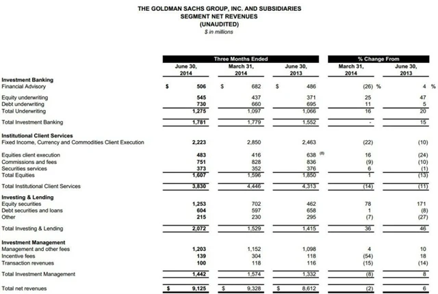 Celkové příjmy podniku ve čtvrtletí stouply o šest procent na 9,1 miliardy dolarů. Příjmy ze samotného investičního bankovnictví vzrostly o 15 % na 1,8 miliardy dolarů.