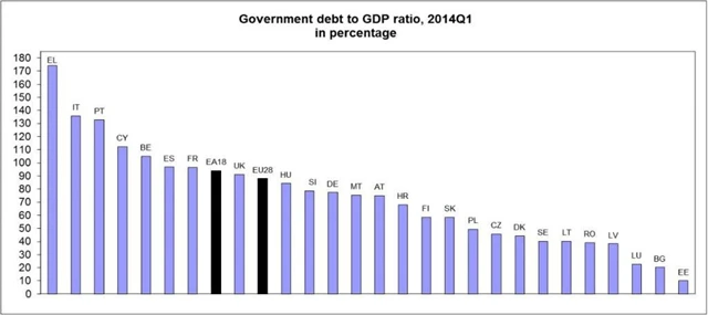 Vládní dluh eurozóny se v prvním čtvrtletí podle dat statistického úřadu Eurostat zvýšil na 93,9 % HDP z 92,7 % HDP na konci čtvrtého kvartálu roku 2013. V celé EU28 se zvýšil na 88 % HDP z 87,2 % HDP. Růst vládního dluhu v eurozóně následuje po dvou čtvrtletích, kdy zadlužení klesalo. V prvním kvartále roku 2013 byl dluh v eurozóně 92,5 % HDP a v EU28 z 86,2 % HDP.