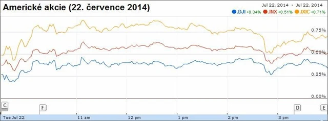 Index Dow posílil o 0,36 % na 17 113,54 bodu, S&P 500 přidal 0,5 % na 1 983,53 bodu (intradenní historické maximum posunul na 1 986,24 bodu) a Nasdaq vzrostl o 0,71 % na 4 456,02 bodu. V plusu se udržely všechny hlavní sektory, nejvíce se dařilo energetickým, technologickým a telekomunikačním společnostem. Index volatility VIX klesl o 7,57 % na 11,84 bodu. Výnos 10letých vládních dluhopisů zůstal beze změny na 2,47 %.