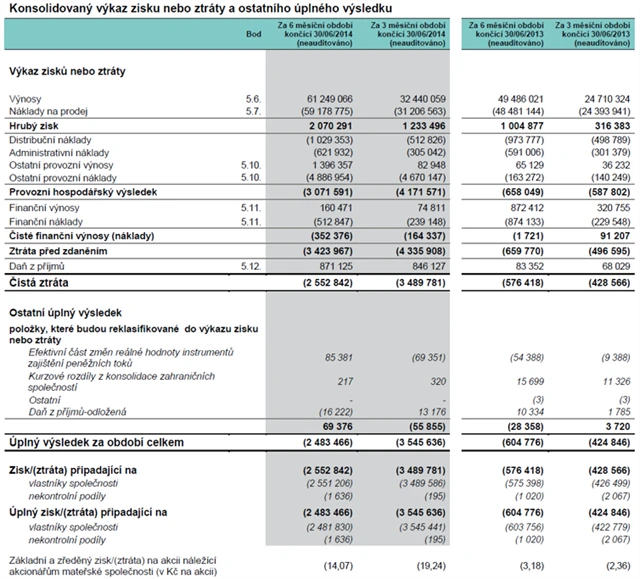 Čistá ztráta ve druhém kvartálu dosáhla 3,49 miliardy Kč, za celé první pololetí to bylo 2,55 miliardy Kč.