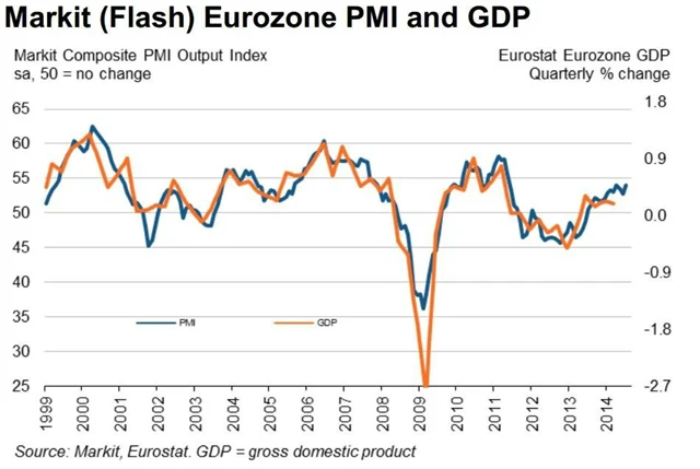 Podle předběžných dat aktivita ve zpracovatelském sektoru eurozóny v červenci mírně zrychlila. Index nákupních manažerů se zvýšil na 51,9 bodu z červnových 51,8 bodu a dosáhl tak dvouměsíčního maxima. Očekával se přitom pokles na 51,7 bodu. Ve službách index vyskočil na 38měsíční maximum 54,4 bodu z 52,8 bodu v červnu a kompozitní index se vyšplhal na 3měsíční maximum 54 bodů oproti 52,8 bodu v červnu.