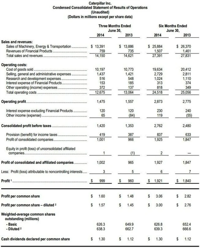 Čistý zisk firmy se v meziročním srovnání zvýšil o 4,1 procenta na 999 milionů dolarů a překonal odhady analytiků. Tržby se snížily o 3,2 % na 14,15 miliardy dolarů, což bylo méně, než se čekalo, uvedla agentura AP. Akcie Caterpillaru po zveřejnění výsledků klesly o téměř dvě procenta.