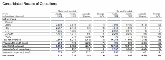 Výsledky Deutsche Bank v 2Q2014: Čistý zisk 238 milionů eur (odhad: 470 milionů eur), zisk před zdaněním 917 milionů eur