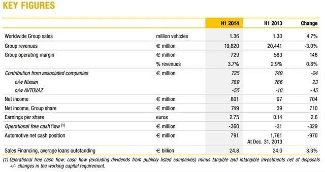 Výsledky Renault v 1H2014: Provozní zisk 729 milionů eur (673 milionů eur), tržby 19,82 milionu eur (meziročně -3 %)