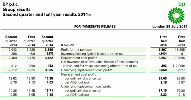 Výsledky BP v 2Q2014: Upravený čistý zisk 3,64 miliardy USD (odhad: 3,42 miliardy USD, loni: 2,7 miliardy USD), tržby 95,83 miliardy USD (loni: 95,7 miliardy USD)