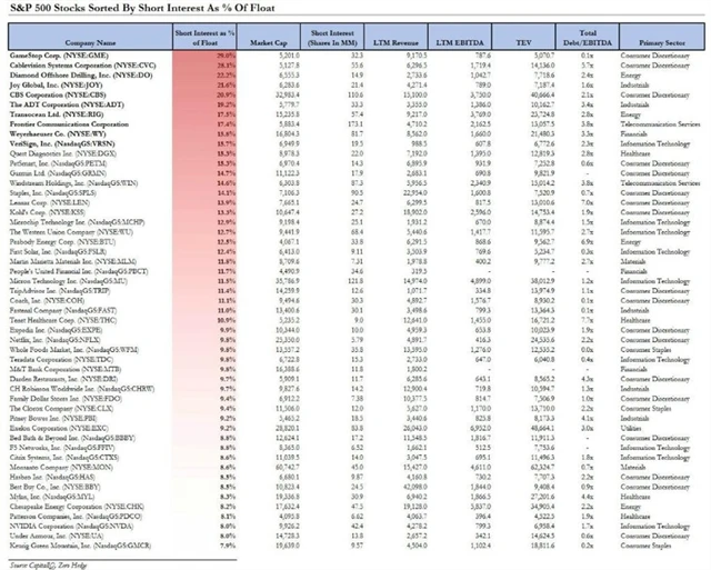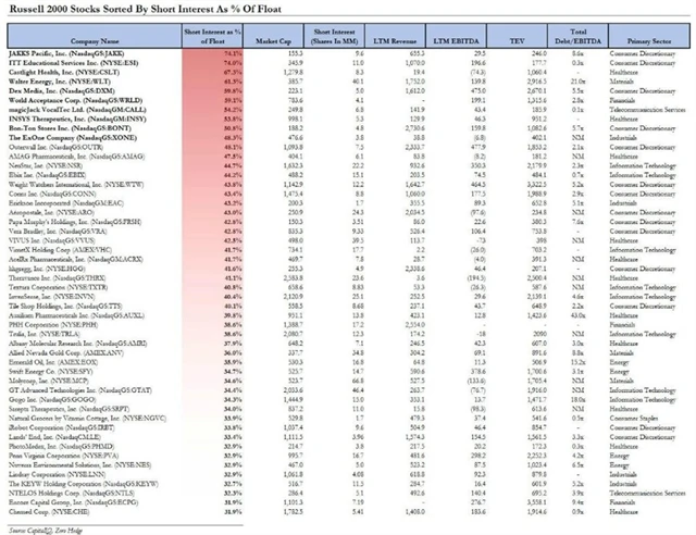 V případě indexu Russell 2000, který zahrnuje firmy s menší tržní kapitalizací, patří mezi nejvíce shortované cenné papíry akcie společností JAKKS Pacific (74,1 % pozic short), ITT Educational Services (74 % pozic short), Castlight Health (67,3 % pozic short), Walter Energy (61,3 % pozic short) a Dex Media (59,8 % pozic short).