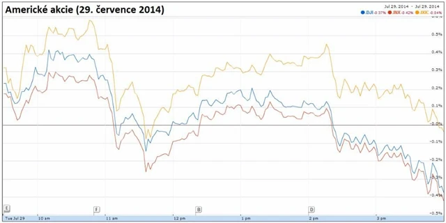 Dow oslabil o 0,42 % na 16 912,11 bodu, širší S&P 500 klesl o 0,45 % na 1 969,95 bodu a Nasdaq odepsal 0,05 % na 4 442,70 bodu. Oslabilo osm z deseti hlavních sektorů. Největší pokles postihl odvětví služeb, akcie průmyslových podniků a cenné papíry energetických firem. Mírně naopak posílily sektor zdravotnictví a odvětví telekomunikací.