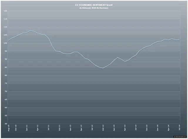 Ekonomická nálada v eurozóně se v červenci mírně zlepšila, a to navzdory pokračující ukrajinské krizi. Index spotřebitelské důvěry v červenci v eurozóně klesl v souladu s odhady na -8,4 (červen: -7,5 bodu). Index sentimentu ve službách klesl na 3,6 bodu z 4,4 bodu v červnu (odhad: 4,4 bodu), index sentimentu v průmyslu naopak vzrostl na -3,8 bodu z -4,3 bodu v červnu (odhad: -4,5 bodu) a index sentimentu v ekonomice vzrostl na 102,2 bodu z 102,1 bodu v červnu (odhad: 101,8 bodu).