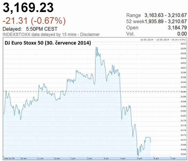 Obchodování na hlavních evropských akciových trzích ve středu skončilo v červených číslech. Nejistota investorů pramenila z nových protiruských sankcí, na nichž se představitelé Evropské unie údajně údajně dohodli již v úterý. Obchodníci zatím nevědí, zda nebude mít zákaz vývozu některého zboží z Evropy do Ruska výrazně negativní vliv také na evropské hospodářství, jež je s ruskou ekonomikou provázáno více než třeba hospodářství USA, které sankce proti Rusku taktéž zpřísnilo.