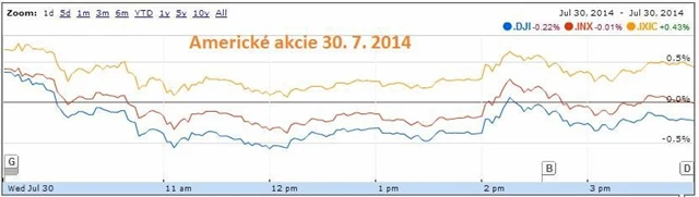 Americké akcie po nečekaně vysokém růstu HDP za 2Q2014 nejprve zdražovaly, postupně však začaly indexy ztrácet. Dvě hodiny před koncem obchodování si investoři vyslechli očekávané rozhodnutí Fedu o dalším omezení odkupu dluhopisů. FOMC zachoval holubičí tón, investoři však přesto spekulují, že by centrální banka mohla začít zvedat dříve úroky.