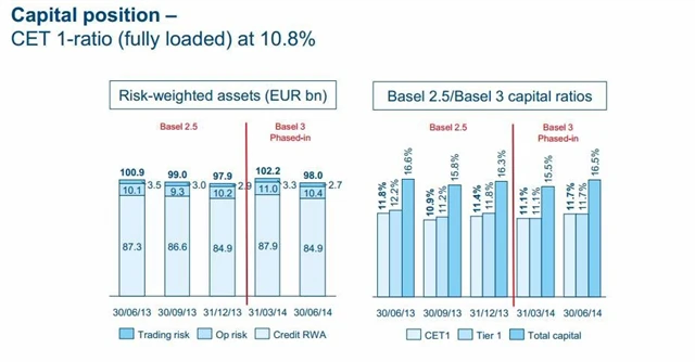 Celkový regulatorní kapitál klesl v 1H2014 na 14,1 miliardy EUR z 14,8 miliardy EUR. Kapitál zahrnutý v Tier 1 vzrostl na 11,5 miliardy EUR proti 11,2 miliardy EUR. Rizikově vážená aktiva zůstala beze změny na 98 milionech EUR. Kapitálová přiměřenost CET 1 vzrostla na 11,7 % a celková přiměřenost vzrostla na 16,5 %.