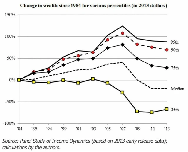 Dokument Russell Sage Foundation ukazuje, že se čistá hodnota majetku průměrné americké domácnosti od roku 2003 do roku 2013 snížila z 87 992 dolarů na 56 335 dolarů, což znamená pokles o 36 %. Jak dále upozorňuje, v průběhu roku 2013 se objevilo jen velmi málo ukazatelů, které by naznačovaly změnu tohoto nepříznivého trendu. Není tedy vyloučeno, že budou domácnosti v USA ještě nějakou dobu chudnout.
