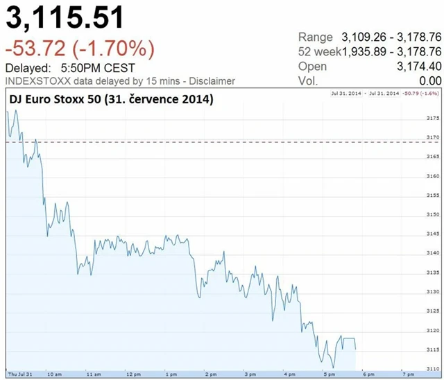 Evropské akcie ve čtvrtek uzavřely výrazně v mínusu. Investoři tak reagovali na údaje o inflace v eurozóně, které na trh poslal úřad Eurostat. Inflace v eurozóně v červenci nečekaně klesla o desetinu procentního bodu na 0,4 % při očekávání stagnace. propad evropských burzovních indexů nedokázaly zvrátit ani slušné hospodářské výsledky velkých firem, ani zpráva, podle které v eurozóně míra nezaměstnanosti v červnu klesla nejníže za dva roky.