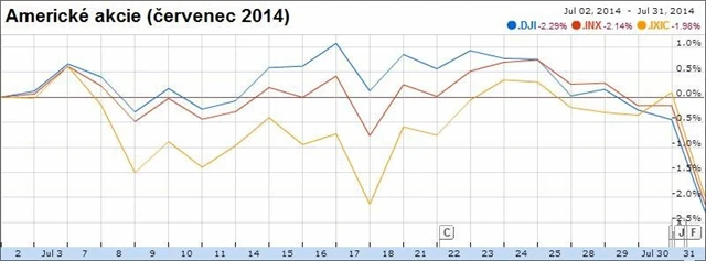 Investoři ve čtvrtek vyjádřily obavu z nízké evropské inflace (červencový odhad +0,4 % meziročně), vedle bankrotu Argentiny pak negativně zapůsobil především skok v nákladech na práci v USA (+0,7 % v 2Q2014, nejvíce od 3Q2008), který naznačuje, že by americké firmy mohly mít problém s udržením vysokých ziskových marží. O těch se přitom poslední zhruba rok hovořilo jako o jednom z důležitých faktorů pro možný obrat býčího trendu na akciovém trhu.