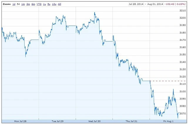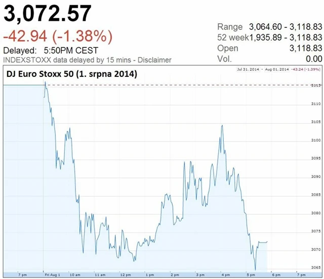 V první polovině týdne se obchodování na evropských akciových trzích neslo v poklidném duchu. V pondělí hlavní evropské burzy uzavřely nejednotně, v úterý burzy v Británii, Německu i Francii vzrostly. Již ve středu se ale trend obrátil a trhy se ponořily do červených čísel. Investoři začali prodávat v důsledku uvalení nových evropských a amerických sankcí na Rusko, později se přidal ještě bankrot Argentiny a svůj díl si vybrala také zpráva o dalším poklesu evropské inflace. Za celý týden tak burzy v Evropě skončily výrazně v mínusu. Britský FTSE 100 od pondělí klesl o 1,73 %, německý DAX se propadl o 4,5 % a francouzský CAC 40 ztratil 2,95 %. Index DJ Euro Stoxx 50 oslabil o 3,23 %.