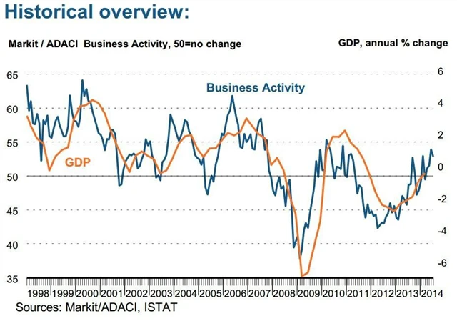 Sektor služeb v Itálii v červenci expandoval pomalejším tempem. Index nákupních manažerů klesl z červnových 53,9 bodu na 52,8 bodu, očekával se mírnější pokles na 53,8 bodu. Kompozitní index klesl na 53,1 bodu z 54,2 bodu.