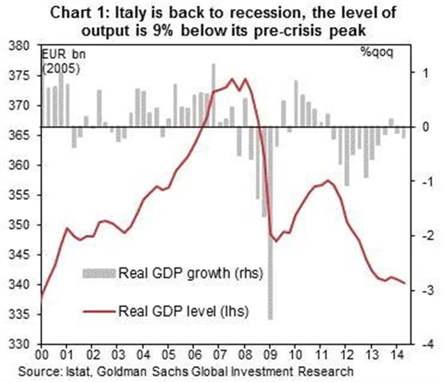 Recese se většinou definuje jako dvě čtvrtletí po sobě, kdy klesá objem hrubého domácího produktu. V prvních třech měsících roku klesla italská ekonomika o 0,1 %.