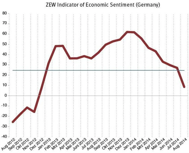 Podle průzkumu institutu ZEW se důvěra analytiků a investorů v německou ekonomiku v srpnu podstatně zhoršila. Index budoucích očekávání nečekaně klesl na 8,6 bodu z červencových 27,1 bodu, očekával se pokles na 17 bodů. Hodnocení současné situace se propadlo na 44,3 bodu z červencových 61,8 bodu, očekával se pokles jen na 54 bodů. Očekávání investorů pro celou eurozónu se rovněž zhoršilo - index klesl na 23,7 bodu z 48,1 bodu.