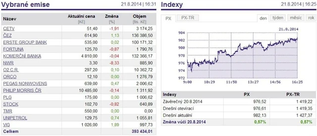 Objem obchodování ve čtvrtek nedosáhl ani 400 milionů korun. Nejobchodovanější akcií byla společnost ČEZ, která zastupovala více než třetinu obchodů a posílila o více než procento. V těsném závěsu za ní se držely cenné papíry Komerční banky, ty však zakončily den lehce pod nulou se ztrátou 0,04 %. I druhá bankovní emise na burze, Erste Group Bank, kolísala kolem nuly, podařilo se jí však uzavřít se ziskem 0,02 %.