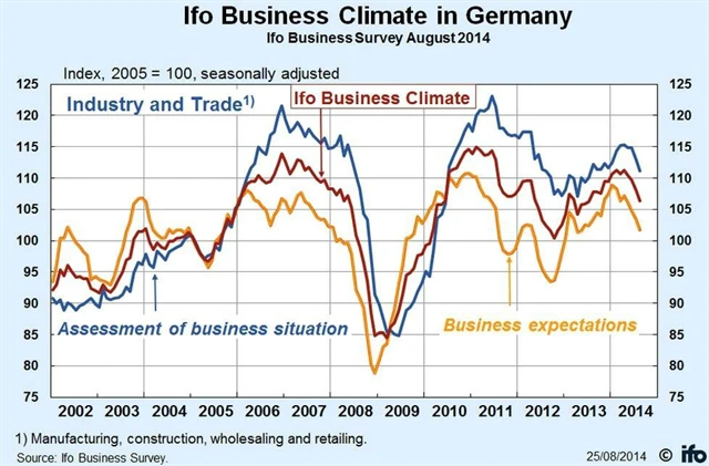 Německá ekonomika ve druhém čtvrtletí mezičtvrtletně klesla o 0,2 % po růstu o 0,7 % v prvním kvartálu. Ekonom Ifo Klaus Wohlrabe v pondělí upozornil, že institut pravděpodobně sníží prognózu letošního hospodářského růstu Německa na 1,5 % ze současných 2,0 %.