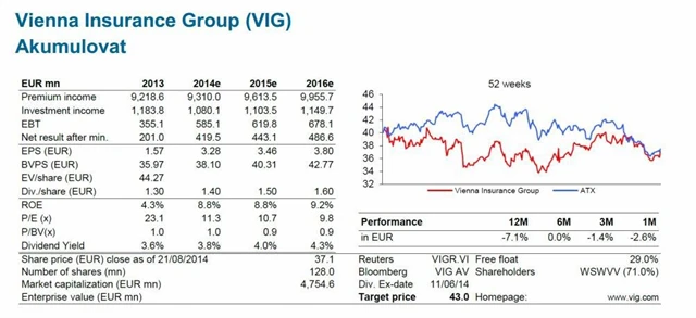 "Snižujeme naše doporučení z 'kupovat' na 'akumulovat', ale zároveň ponecháváme naši cílovou cenu beze změny na 43 EUR. Růstové vyhlídky, které VIG může nabídnout, by se podle nás měly odrazit v ocenění nad účetní hodnotou," píše Unger.