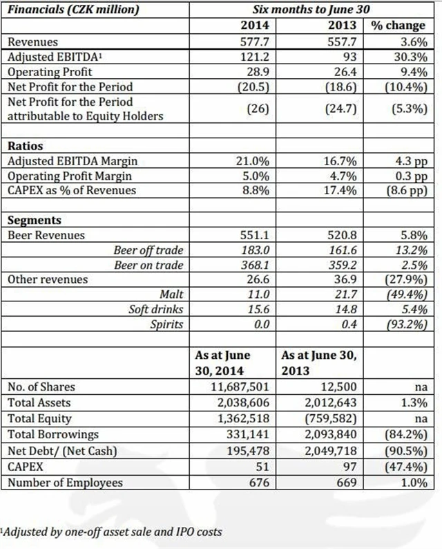 Celkové konsolidované tržby v prvním pololetí roku 2014 meziročně vzrostly o 3,6 % na 577,7 milionu Kč. Samotné tržby z prodeje piva meziročně vzrostly o 5,8 % na 551,1 milionu Kč, a to jak v prodejích do klíčových řetězců, kde celkové tržby vzrostly o 13,2 % na 183 milionů Kč, tak i v prodeji na nezávislém trhu (pohostinství a restaurace), kde se tržby zvýšily o 2,5 % a dosáhly 368,1 milionu Kč. Nárůst tržeb je tvořen jak růstem prodejů, tak realizovanou vyšší cenou za prodaný hektolitr.