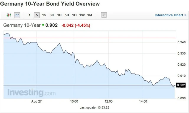 Výnos německých desetiletých dluhopisů klesá poprvé v historii pod 0,9 % Redakce IW27. 8. 2014 | 15:52NěmeckoZdroj: BloombergNěmecké státní dluhopisyNěmeckoRedakce IW Další články autoraTOP 10 článků týdne: Investiční tipy, Moskva vůči Pekingu a AI pokaždé jinakOčekávané výsledky světových firem v týdnu od 10. listopadu: Walt Disney, Cisco Systems, RWE, ČEZJak vydělat na jednorožcích dříve, než se na ně vrhnou investoři na burze DoporučujemeNestihli jste naskočit do zlaté rally? Vůbec není pozdě, říká stratégZlatoRychlé peníze ve velkém opustily zlato a stříbro. Trh se připravuje na další růstZlatoAI euforie žene index S&P 500 do extrémů. Bank of America radí, kam teď "schovat" penízeDiverzifikace investic Aktualitydnes | 11:45Bank of England zmírňuje postoj ke stablecoinůmdnes | 11:22Odvolací soud odmítl žádost Trumpovy administrativy o zastavení výplaty dávek SNAPdnes | 11:04Colt CZ Group zveřejnila pozvánku na valnou hromadu k hlasování o vydání akcií dnes | 10:50Asijské trhy zakončily den v zelených číslech, oživení vedla Jižní Koreadnes | 10:39Nezaměstnanost v Česku v říjnu vzrostla na 4,6 %dnes | 10:19Rumble oznámila převzetí německé AI firmy Northern Data za 767 mil. USDdnes | 10:16Colt CZ Group vydala dluhopisy za šest miliard, zájem investorů byl vysokýdnes | 10:05Silný zájem o IPO nestačil, Lenskart po slabém debutu ztrácídnes | 9:40Bessent: Trumpova "dividenda" by mohla mít podobu daňových úlevdnes | 9:28Pražská burza v úvodu posiluje: Index PX +0,48 %, Gevorkyan +1,74 %, ERSTE +1,66 %, Doosan Škoda Power +1,73 %, ČEZ +0,46 % dnes | 9:20Evropské akcie v úvodu: STOXX Europe 600 +1,13 %, FTSE 100 +0,67 %, DAX +1,61 %, CAC 40 +1,12 % dnes | 1:58Americký Senát je údajně připraven ukončit rekordně dlouhý vládní shutdownZobrazit všechny aktuality Nejčtenější tento týden1.Nestihli jste naskočit do zlaté rally? Vůbec není pozdě, říká stratég2.Rychlé peníze ve velkém opustily zlato a stříbro. Trh se připravuje na další růst3.AI euforie žene index S&P 500 do extrémů. Bank of America radí, kam teď "schovat" peníze4.Příští vláda shrábne makroekonomický jackpot5.Dvě fakta o velkých akciových propadech, která vás možná překvapí6.Bank of America varuje: Americké akcie působí zdravě, ale trh uvnitř hnije Sledujte násinvesticniweb.cz14000Investiční web19300LIVE2300Investiční web1000investicni_web500Investicniweb.cz33600