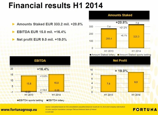 Sázkové kanceláři Fortuna v prvním pololetí letošního roku vzrostl zisk před zdaněním, úroky a odpisy (EBITDA) o 16,4 % na 15 milionů eur. Čistý zisk stoupl dokonce o 19 % na 9 milionů eur. Celkový objem přijatých sázek se zvýšil v meziročním srovnání o 20,8 % na 333,2 milionu eur. Za růstem zisku podle společnosti stojí vyšší aktivita internetových sázkařů na všech třech trzích.