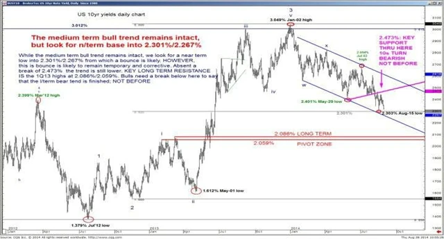 Curry připustil, že se výnosy 10letých amerických vládních dluhopisů nacházejí v sestupném trendu. Neopomněl však poznamenat, že se blíží svému lokálnímu maximu, po kterém přijde odraz, i když jen krátkodobý. Výnosy se podle něj odrazí od Fibonacciho retracementu 2,301 %, případně od 8,5měsíční hladiny podpory 2,267 %. Poté bude podle BoA důležitá hladina 2,473 %, jejíž případné zpětné proražení směrem nahoru by nakonec přece jen mohlo dát shortujícím za pravdu.