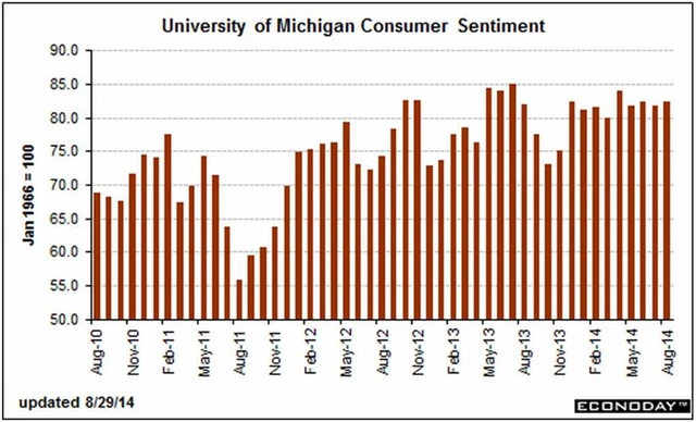 Spotřebitelská důvěra ve Spojených státech v srpnu překvapivě stoupla a spotřebitelé současnou ekonomickou situaci hodnotí nejlépe za sedm let. Vyplývá to z pátečních výsledků průzkumu agentury Reuters a Michiganské univerzity. Souhrnný index spotřebitelské důvěry stoupl na 82,5 bodu z červencových 81,8 bodu. Předběžný odhad (flash) přitom hovořil o poklesu indexu na 79,2 bodu.