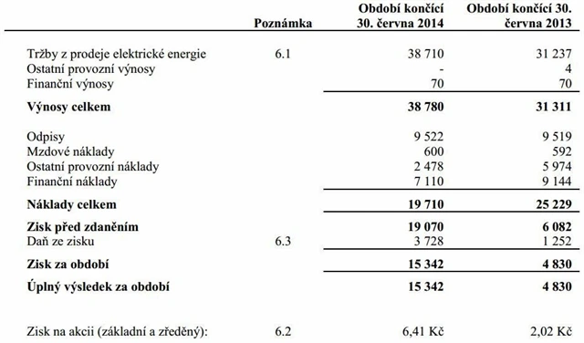 Solární společnost vykázala za 1. pololetí výrobu 2 630 MWh elektrické energie (+21,3 % meziročně), což odpovídá tržbám 38,7 milionu Kč. Konsolidovaný zisk dosáhl 15,3 milionu Kč (6,41 Kč/akcii) oproti 4,8 milionu Kč před rokem.