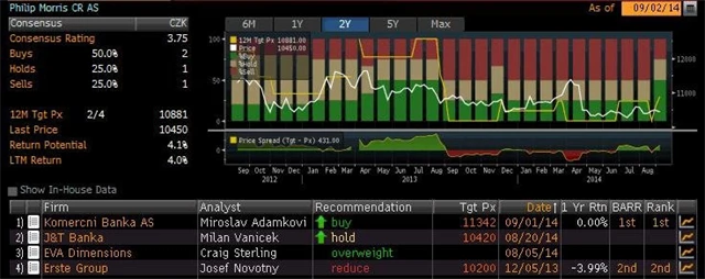 Komerční banka zvyšuje doporučení na akcie Philip Morris ČR na "kupovat", cílová cena 11 342 Kč Redakce IW1. 9. 2014 | 16:25Investiční doporučeníZdroj: BloombergAkcie ČRInvestiční doporučeníPhilip Morris ČRRedakce IW Další články autoraTOP 10 článků týdne: Investiční tipy, Moskva vůči Pekingu a AI pokaždé jinakOčekávané výsledky světových firem v týdnu od 10. listopadu: Walt Disney, Cisco Systems, RWE, ČEZJak vydělat na jednorožcích dříve, než se na ně vrhnou investoři na burze DoporučujemeNestihli jste naskočit do zlaté rally? Vůbec není pozdě, říká stratégZlatoRychlé peníze ve velkém opustily zlato a stříbro. Trh se připravuje na další růstZlatoAI euforie žene index S&P 500 do extrémů. Bank of America radí, kam teď "schovat" penízeDiverzifikace investic Aktualitydnes | 15:41Americké akcie v úvodu: Dow +0,16 %, S&P 500 -0,20 %, Nasdaq Composite -0,50 %dnes | 15:16Výrobce chytrých prstenů Oura hlásí raketový růstdnes | 15:00AI vs. lidskost: Jak technologie mění důvěru zákazníkůdnes | 14:30Britská libra i státní dluhopisy kolísají, rostoucí nezaměstnanost zvyšuje tlak na Bank of Englanddnes | 14:14CoreWeave snižuje výhled tržeb, akcie prudce oslabujídnes | 13:49SoFi spouští obchodování s kryptoměnamidnes | 13:33Futures na americké akcie: Dow +0,04 %, S&P 500 -0,18 %, Nasdaq 100 -0,34 %dnes | 12:59Komerční banka obdržela aktualizovanou informaci o minimální úrovni kapitálového poměrudnes | 12:48Až 60 % firem nedokáže vysvětlit rozdíly ve mzdáchdnes | 12:31Trump naznačuje snížení cel na Indii poté, co byl velvyslancem jmenován loajální Sergio Gordnes | 12:08Nálada investorů v eurozóně se zlepšila víc, než se očekávalodnes | 11:49USA a Švýcarsko pracují na dohodě o snížení celZobrazit všechny aktuality