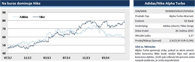Pokud se bude outperformance Nike oproti Adidasu nadále zvyšovat, nabízí Alfa Turbo warranty šanci na vysoké výnosy. S nimi může investor profitovat z rozdílu vývoje dvou podkladových aktiv, a to nezávisle na absolutním vývoji celého trhu. Je tedy jedno, zda kurzy rostou, nebo klesají, důležitý je relativní vývoj cen akcií Nike a Adidas.