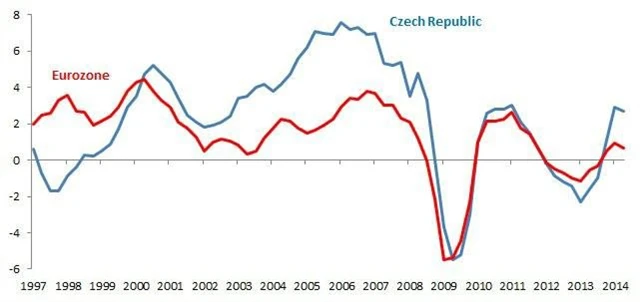 The Czech economy was not doing well in previous five years. Look at the key figures. In 1999-2008, the Czech GDP rose 30 percentage points more than the one of Eurozone. But in 2009-2013, the Czech economy shrank 3.4 percentage points, even more than 2.7% decline of Eurozone. That was driven by painful fiscal consolidation besides temporary decline in export markets, weak credit growth and slowdown in the inflow of foreign direct investments.