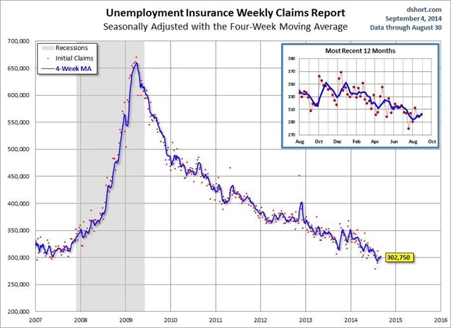 Počet nových žádostí o podporu v nezaměstnanosti v USA v týdnu do 30. srpna vzrostl o 4 tisíce na 302 tisíc. Čekal se mírnější růst na 300 tisíc z předchozích 298 tisíc. Počet pokračujících žádostí vzrostl v týdnu do 23. srpna na 2,464 milionu z 2,528 milionu (revidováno z 2,527 milionu). Čtyřtýdenní průměr nových žádostí vzrostl o 3 tisíce na 302,75 tisíce.