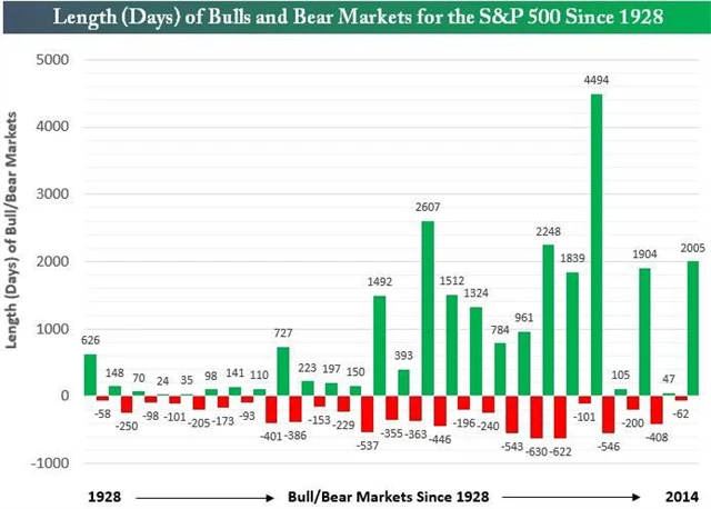 Myšleny jsou kalendářní dny, ne dny, kdy se obchodovalo. Jde o čtvrtý nejdelší růst cen akcií bez alespoň 20% propadu od roku 1928. Mimochodem, právě tento víkend index slaví 2007 dnů růstu, shodou okolností na úrovni 2007 bodů.