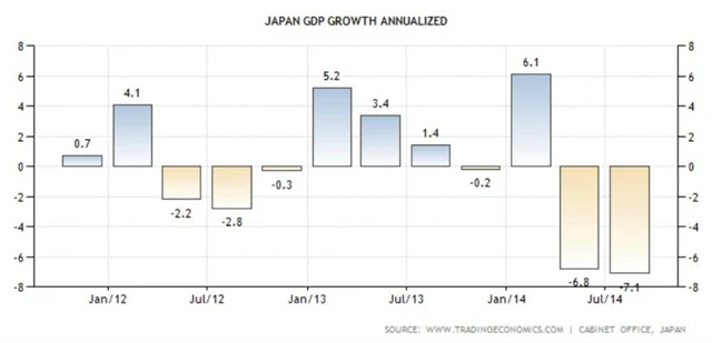 Japonská ekonomika podle revidovaných údajů klesla ve druhém čtvrtletí mnohem více, než se čekalo, a její propad byl nejhorší od prvního čtvrtletí 2009, kdy vývoz ze země a tovární výrobu zasáhla globální finanční krize. Japonská vláda v pondělí oznámila, že hrubý domácí produkt se v od dubna do června snížil v celoročním přepočtu o 7,1 % místo původně uváděných 6,8 %. Zpráva vyvolala obavy, že dubnové zvýšení daní mělo na ekonomiku mnohem větší dopad, než se čekalo.